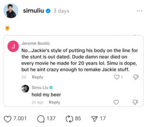 Ein Fan postete einen wahrscheinlich selbst kreierten Screenshot, in dem er behauptet, dass Liu zu alt sei, um den klassischen Actionstil à la Jackie Chan noch ausführen zu können, also seine Stunts selbst zu machen. Zu diesem Screenshot gehört eine Antwort eines wohl ebenfalls fabrizierten Simu-Liu-Accounts, der antwortet „hold my beer“. Alles lustig bis hierhin. Doch Ernst wurde es, als der echte Simu Liu diesen Fan-Post teilte und nur dazu schrieb „🍺“.